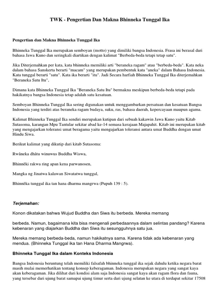 Pada mulanya istilah kata bhinneka tunggal ika diambil dari bahasa jawa kuno yang apabila saling dipisahkan maka akan mempunyai arti bhinneka = beragam atau beraneka, sedangkan kata tunggal yang berarti = satu, dan ika = itu. Bhinneka tunggal ika berasal dari bahasa jawa kuno, yang ketika dipisahkan menjadi bhinneka artinya berbeda, tunggal artinya satu dan ika artinya itu. Diartikan dalam satu persatu kata, yaitu bhinneka yang berarti beraneka ragam, diambil dari kata neka dalam bahasa sansekerta yaitu macam. Kitab kakawin mengajarkan toleransi antar agama. Hal dalam prinsip kedua ini dilandaskan adanya rasa cinta dan mencintai, rasa hormat menghormati. Sifat dari bhinneka tunggal ika tidak formalistis, di mana tidak hanya akan menunjukkan perilaku semu serta kaku. Dari terjemahan itulah kalimat bhinneka tunggal ika menjelma menjadi jati diri bangsa indonesia. Bhinneka tunggal ika adalah moto atau semboyan bangsa indonesia yang tertulis pada lambang negara indonesia, garuda pancasila. Itu menjadi semboyan bangsa indonesia dan tertulis pada lambang negara garuda pancasila. Semoboyan ini refrensi dari kitab sutasoma. Bhinneka tunggal ika merupakan sebuah karya sastra agama atau kakawin jawa kuna yaitu kakawin sutasoma berikut adalah kutipan yang berasal dari kakawin sutasoma pada pupuh 139, bait 5 bhinneka tungga ika memiliki arti tersirat dan tersurat yang menunjukkan bahwa bangsa indonesia. Seperti yang telah kami singgung sebelumnya bahwa pertama kali kalimat bhinneka tunggal ika diperkenalkan pada masa pemerintahan kerajaan majapahit yaitu di. Ia merupakan kenyataan yang tidak bisa ditolak, dihindari dan disangkal.